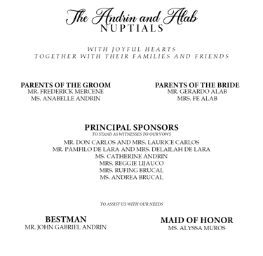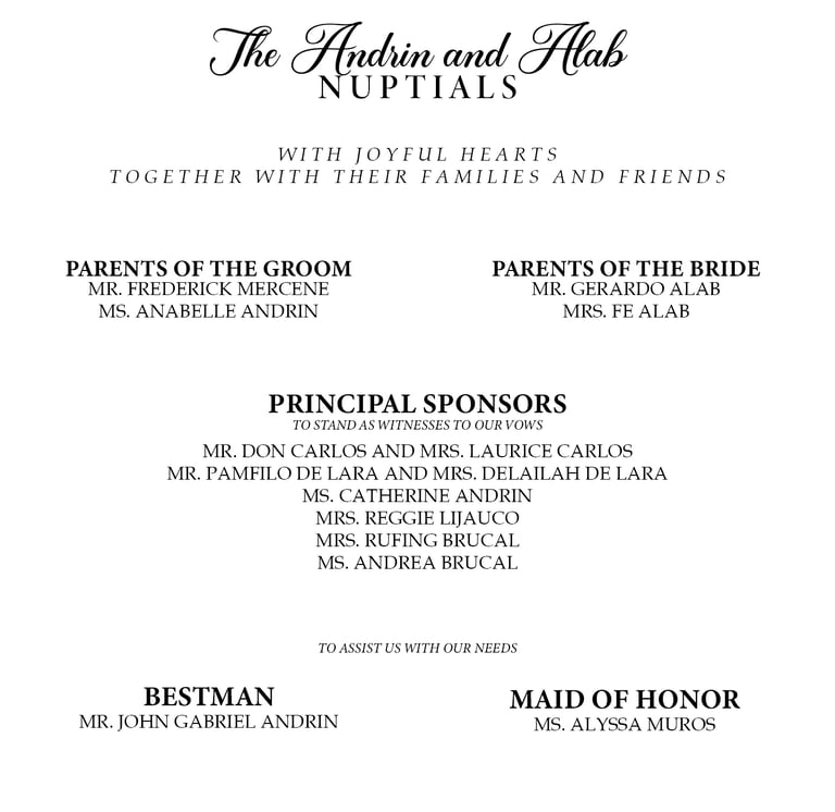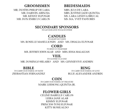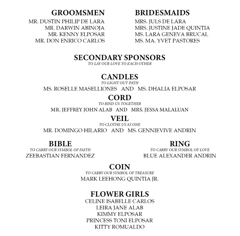 THE PRESENCE OF ALL OF THE PRINCIPAL SPONSORS IN THE CHURCH ARE REQUESTED TO BE EARLIER THAN 2:00 PM. SEE YOU THERE!
